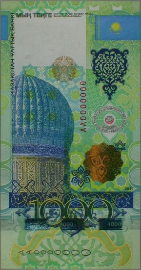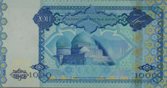 Оборотная сторона: преобладающие изображения – горизонтальные. Основное изображение по середине: мавзолей Ходжа Ахмета Яссауи. Внизу слева, посередине и справа расположены цифровое и буквенное обозначение номинала банкноты. Сверху посредине напечатана надпись "ҚАЗАҚСТАН ҰЛТТЫҚ БАНКІ". Надпись на русском языке, предупреждающая об ответственности за подделку, "Подделка банкнот преследуется по закону" расположена внизу посредине под цифровым обозначением номинала банкноты.